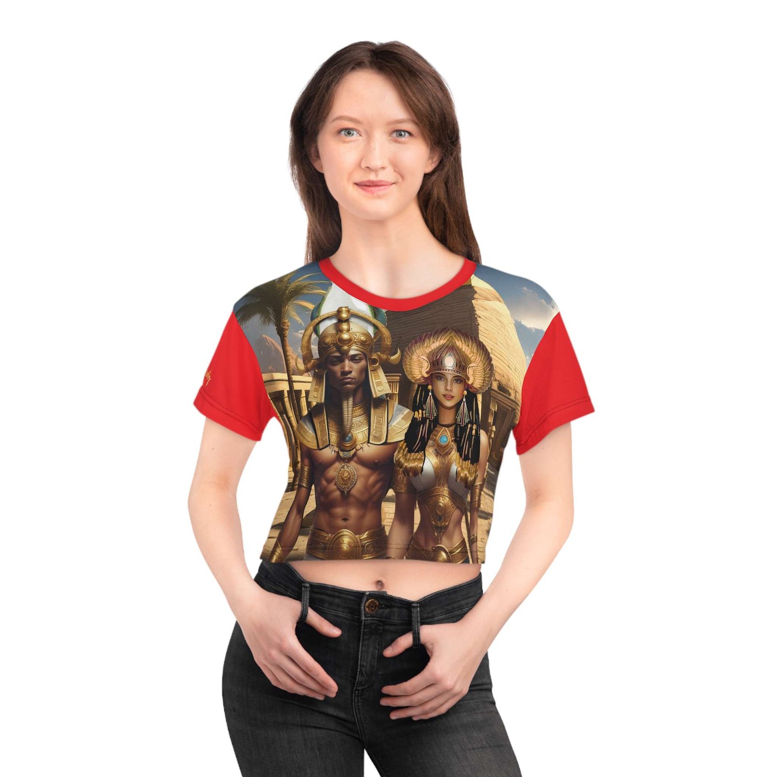 Unleash your inner style with this striking Crop Tee that blends comfort with eye-catching design of the loving couple; Isis and Osiris. Perfect for warm days and casual outings, this tee features a vibrant print that showcases our original artwork. The light fabric ensures you stay cool and fashionable, while the ribbed knit collar maintains its shape, making it a versatile addition to your wardrobe. Ideal for fashion enthusiasts, this Crop Tee fits seamlessly into summer gatherings, festivals, or any occasion where you want to stand out. Celebrate your unique style with this one-of-a-kind piece that’s great for birthdays, summer parties, or just to brighten up your everyday look.