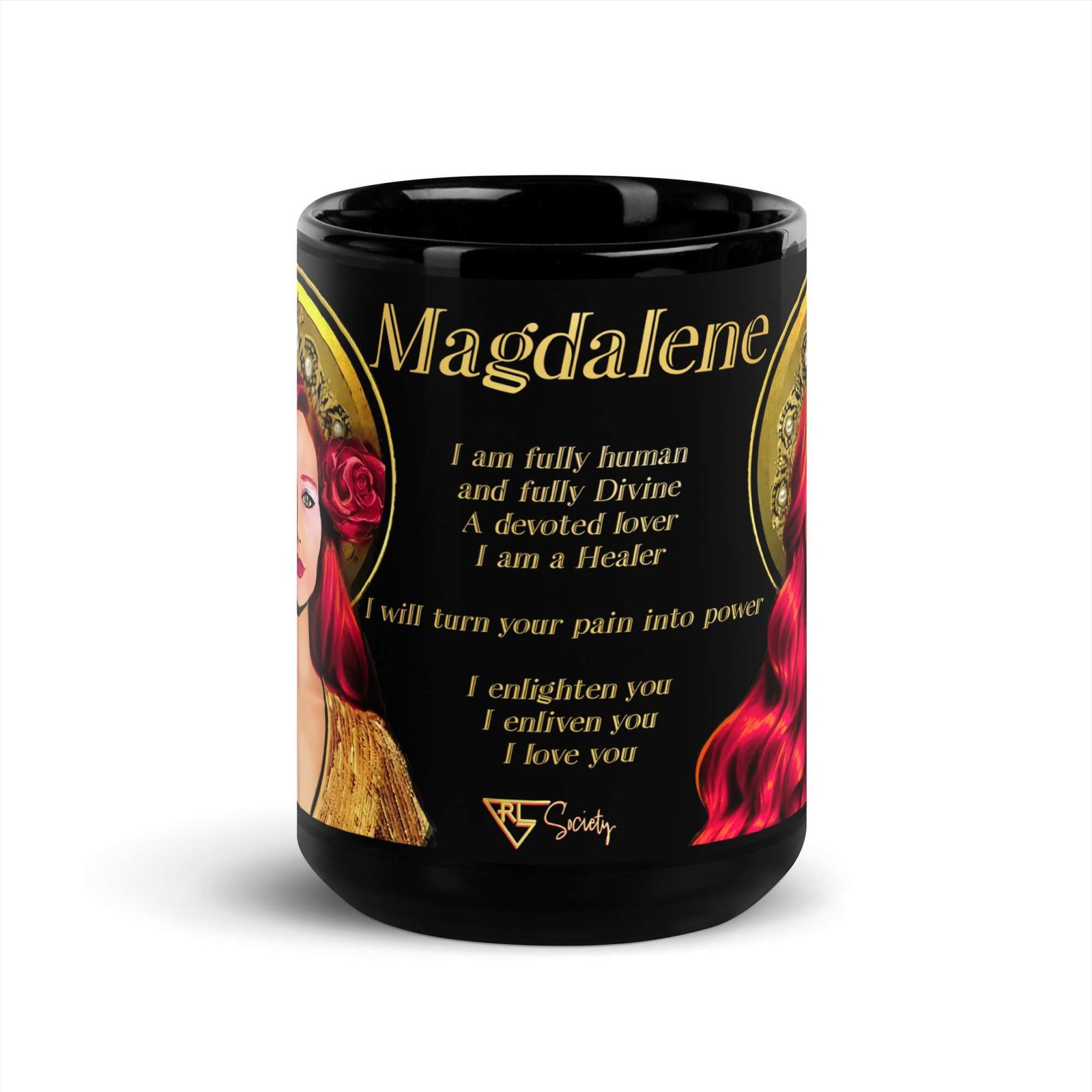 These black mugs come in one size – 15oz (0.44l) – plenty for morning caffeine boosts and hot cups of tea on a rainy day. They’re easy to grip and feel sturdy thanks to the C-shaped handle. Goddesses are printed on the black ceramic material in picture-perfect quality with a glossy finish.